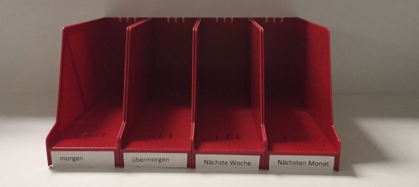 Einer der häufigsten Gründe warum man gewisse Aufgaben aufschiebt, ist ein zu großer Arbeitsaufwand diese zu bewältigen. Deshalb sollte man versuchen, große Aufgaben nach Möglichkeit in Kleinere aufzuteilen. Beispiel Ablage: Ablage ist weder wichtig noch dringend daher ist sie das Paradebeispiel für eine Tätigkeit die man auch aufschieben kann. Steht erst einmal ein Ablagefach mit einem 20 cm hohen Papierstapel vor einem, ist es klar, dass man diesen nur wiederwillig bearbeiten wird. Diesen ordentlich abzulegen würde ca. 2 Stunden dauern, Zeit die man nur äußerst ungern für so etwas opfert. Teilt man diese Arbeit jedoch auf, und Arbeitet bis zur Vollendung nur ca. 15 min am Tag daran, ist die Überwindung, endlich mit der Ablage zu beginnen, wesentlich geringer.