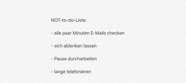 Warum du dir eine NOT To-do-Liste erstellen solltest! To-do-Listen erfreuen sich bereits seit langem wachsender Beliebtheit. Sie sind die erste Wahl wenn es um das Thema Aufgabenmanagement geht. Doch auch eine Not-to-do-Liste kann ein sehr nützliches Werkzeug sein. Wie der Name schon sagt, notiert man auf einer Not-to-do-Liste alles was man nicht mehr tun möchte, doch für wen oder warum kann dies von Nutzen sein? Die klassische Anwendung eine Not-to-do-Liste im Zeitmanagement ist die Auflistung deiner größten Zeitfresser, Tätigkeiten die du aufgrund ihres Zeitaufwands minimieren oder gänzlich einstellen möchtest. Dazu kann beispielsweise – das ständige Überwachen und Lesen der Mails, sich immer wieder stören zu lassen und deshalb Dinge nicht zu Ende zu bringen oder andauernd Social Media Postings zu checken – gehören. Besonders hilfreich ist eine Not-to-do-Liste wenn man die Abteilung gewechselt hat oder befördert wurde. Eine Beförderung bringt nicht nur mehr Verantwortung sondern auch neue Aufgaben mit sich, was bedeutet dass man für einige der Tätigkeiten die man seit Jahren gewohnt ist zu tun, nun keine Zeit mehr haben wird. Diese gilt es sich abzugewöhnen und zu delegieren. Manche der Aufgaben werden ohnehin aufgrund der Beförderung auf andere Mitarbeiter übertragen, doch im Tagesgeschäft ist es nicht auszuschließen, dass hier und da noch ein paar Aufgaben auf einen zurückfallen für die man jetzt keine Zeit mehr hat. Beispielsweise wenn der Kollege kurz Hilfe von einem möchte, da man sich ja besser auskennt als der neue Mann. Natürlich könnte man helfen und wahrscheinlich ist man besser und schneller, doch genau diese Zeit fehlt einem dann am Ende des Tages und die primären eigenen Aufgaben könnten auf der Strecke bleiben. Ein klassischer Fall für die Not-to-do-Liste!