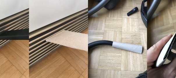 Wer schnell und effizient den Staub aus schmalen Ritzen – für welche die Fugendüse zu breit ist – entfernen möchte, der kann hierfür die leere Papprolle vom Küchenkrepp oder Toilettenpapier verwenden. Vorne etwas zusammengedrückt, lassen sich damit sogar die Schienen unter den Autositzen reinigen. Eventuell musst du die Rolle mit der Hand etwas in Form bringen, damit sich diese nicht gänzlich zusammenzieht und somit verschließt.