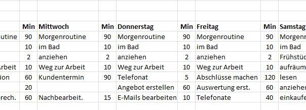 Am Anfang kann es sein, dass du vergisst die Zeit zu stoppen oder dir die Werte einzutragen, doch lass dich dadurch nicht entmutigen, es geht hier nicht um Sekunden. Wenn du einmal etwas vergessen hast, überlege was du getan hast, schätze den Zeitaufwand und trage es nach. Nach einer Weile gewöhnst du dich an diese Erfassung und bekommst recht bald brauchbare Ergebnisse. Je nach dem wie abwechslungsreich dein Alltag ist, solltest du ca. 3-5 Tage dafür benötigen.