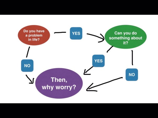 Sorge dich nicht zu sehr um Probleme! Vor allem verschwende deine Zeit nicht mit der Suche nach Problemlösungen, für Probleme die eventuell überhaupt nicht eintreten werden oder noch schlimmer, Angelegenheiten für die es ohnehin zu spät ist.